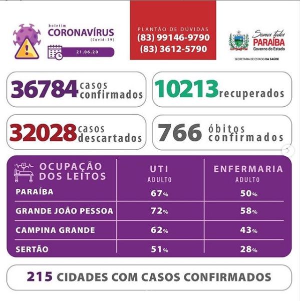 Os dados epidemiológicos e de ocupação de leitos estão disponíveis em: www.paraiba.pb.gov.br/coronavirus