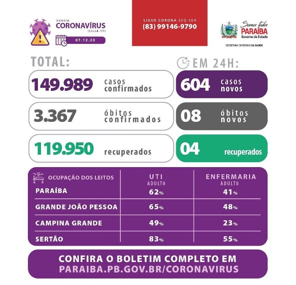 Nesta segunda, 07 de dezembro, a Paraíba registrou 604 novos casos de Covid-19 e 08 óbitos confirmados desde a última atualização, 02 deles ocorridos nas últimas 24h. Até o momento, 149.989 pessoas já contraíram a doença, 119.950 já se recuperaram e 3.367, infelizmente, faleceram. Até o momento, 479.257 testes para diagnóstico da Covid-19 já foram realizados.